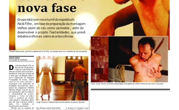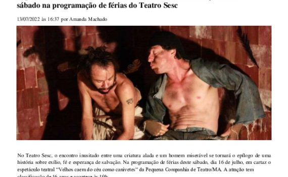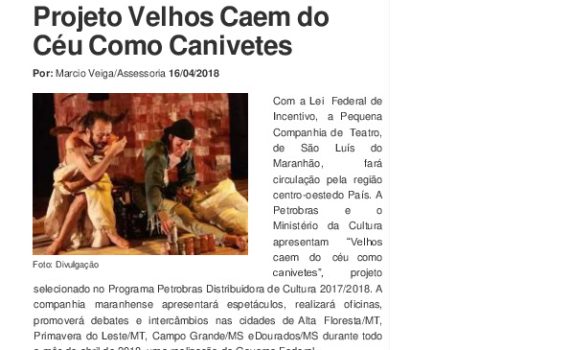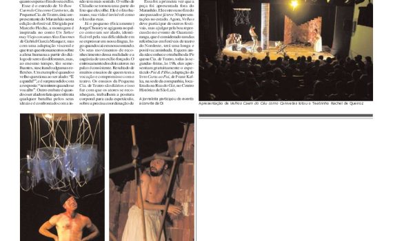 Matéria publicada no Caderno Alternativo do jornal O Estado do Maranhão sobre espetáculo Velhos caem do céu como canivetes , Premiado pela Fundação Nacional das Artes.